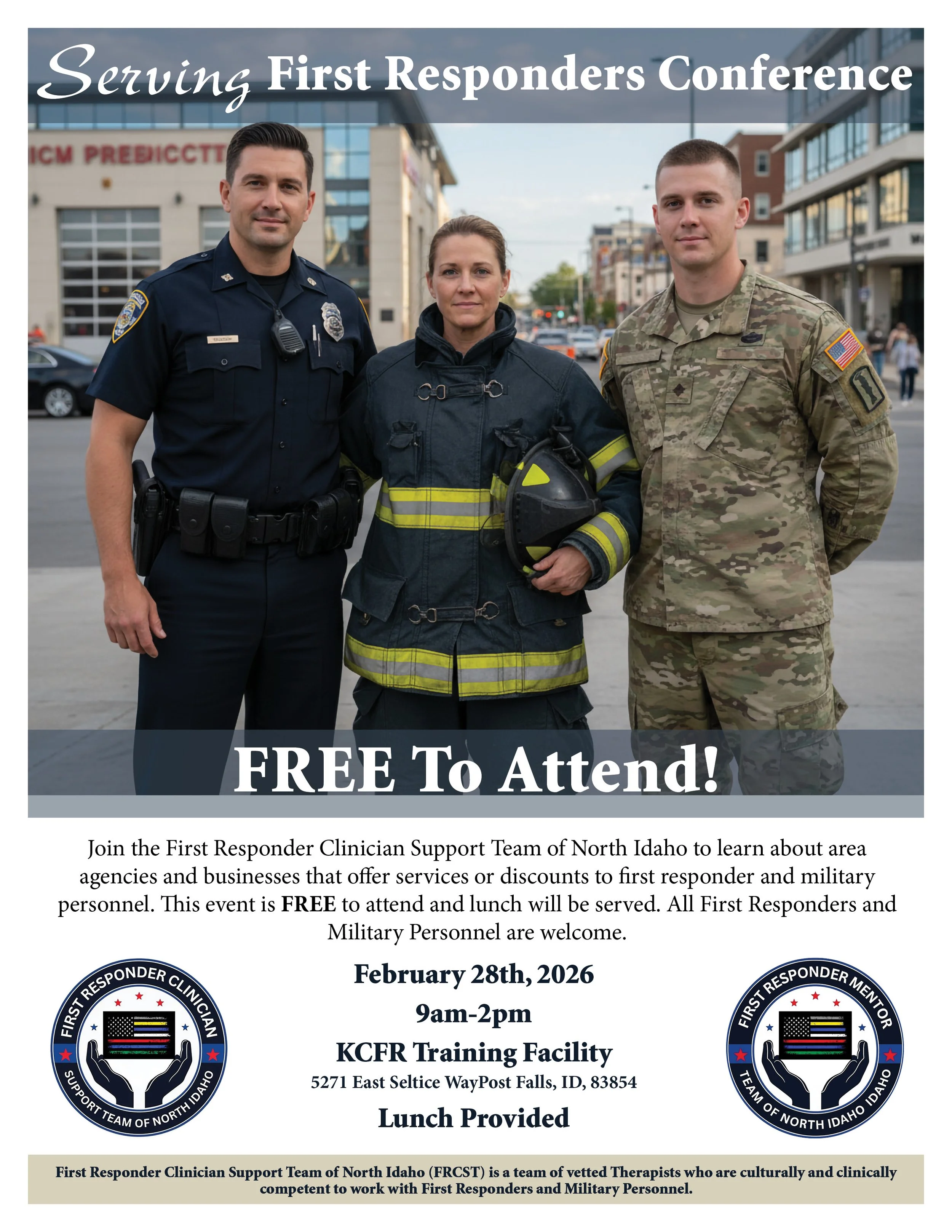 Join the First Responder Clinician Support Team of North Idaho to learn about area agencies and businesses that offer services or discounts to first responder and military personnel. This event is FREE to attend and lunch will be served. All First Responders and Military Personnel are welcome.